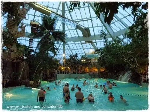 Sehr beeindruckend ist „Monkey Splash“ hier rutscht ihr mit bis zu 30km/h in 13 Metern Höhe über dem Wellenbad durch ein Stück gläserne Rutsche, danach gelangt ihr in eine Art Trichter. Absolut genial ist auch der Wasserstrudel, dieser verläuft einen Großteil der Strecke außerhalb der Halle, von der derzeitigen Außentemperatur von ca. 4 Grad bemerkt man in dem schön warmen Wasser überhaupt nichts.